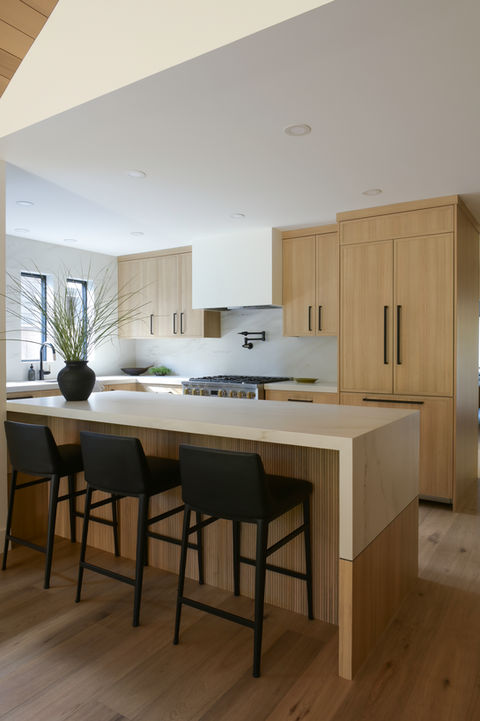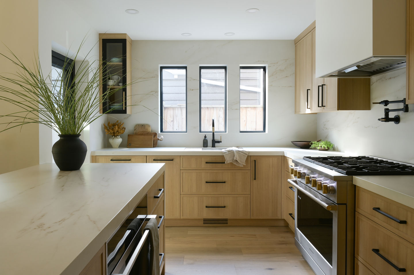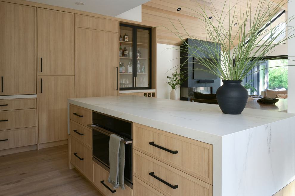 Beach Grove Social transforms a dated 3-bed, 2.5-bath into a modern, moody home made for entertaining. Vaulted cedar ceilings and triangular clerestories bathe white oak and graphite finishes in soft light, while a linear hearth anchors the open living–dining core. The reimagined kitchen hides the daily clutter with a concealed appliance garage and a grain-matched door to the laundry, keeping surfaces calm. Full-width sliders dissolve the boundary to a terrace designed for gatherings. Three new bathrooms—each tailored to its user—pair refined materials with serene lighting to deliver sophisticated, restorative spaces.